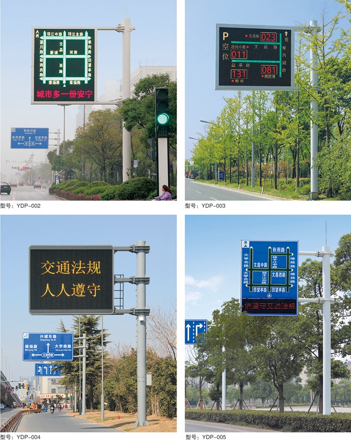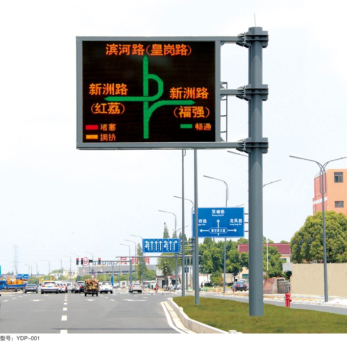交通誘導屏安裝于城市道路路面上方,為駕駛人員提示目前的道路路況信息,交通狀況如:前方施工車禍地點、強風、濃霧等警示標語;還可顯示誘 導地圖: (紅:塞車;綠:暢通;黃:擁堵)等,以便駕駛人員能更好地掌握目前的路況情況,避免交通堵塞,減少交通事故的發生。